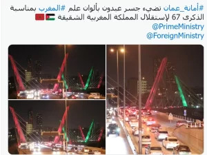 ونشرت “أمانة بلدية عمان الكبرى” على حسابها في إحدى مواقع التواصل الإجتماعي صورا لجسر عبدون مضاءً بألوان العلم المغربي.