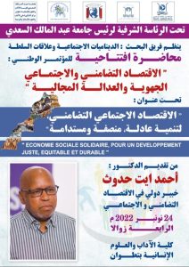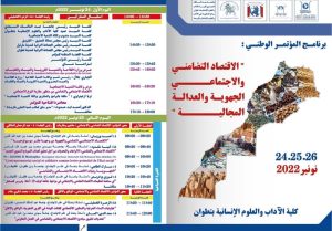 نظمت كلية الآداب و العلوم الإنسانية التابعة لجامعة عبد المالك السعدي بتطوان خلال أيام /24و 25و 26 من شهر نونبر 2022 ، مؤتمرا وطنيا حول موضوع “الاقتصاد التضامني الاجتماعي: الجهوية والعدالة المجالية” من تنظيم فريق البحث في الديناميات الاجتماعية وعلاقات السلطة بالكلية، و لقد سينطلق أشغال المؤتمر بكلمة توجيهية في الموضوع لكل من السيد بوشتى المومني رئيس جامعة عبد المالك السعدي، والسيد مصطفى الغاشي عميد كلية الآداب والعلوم الإنسانية بتطوان، وبمساهمة مندوب وكالة التنمية الاجتماعية، ورئيس مجلس عمالة المضيق الفنيدق، ورئيس مجلس جماعة مرتيل، ورئيس مجلس جماعة تطوان، كما سيشمل المؤتمر إلقاء عرض من طرف وزارة الفلاحة والتنمية القروية والمياه والغابات، و عرض آخر من تقديم الوكالة التنمية الاجتماعية …